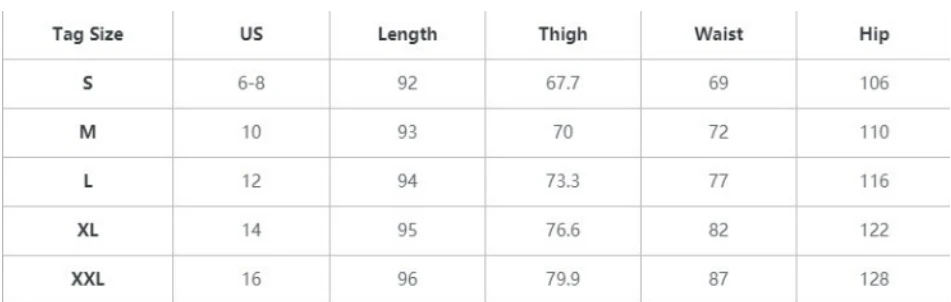 | Size | Pants length(cm) | Waistline(cm) | Hips(cm) |